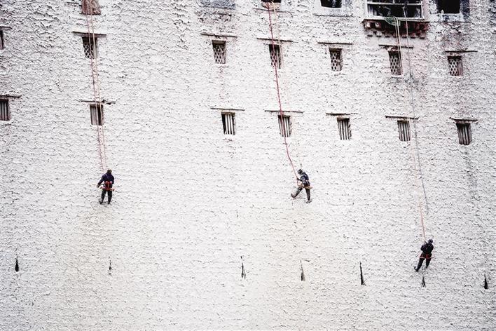 據悉,工作人員要先對涂料進行過濾,然后再進行噴灑。而人力無法抵達的地方則由專業人員化身“蜘蛛人”用涂料噴槍進行粉刷。在高空作業的“蜘蛛人”是經過培訓的特定人員,“蜘蛛人”懸掉在空中,并有專人負責拉繩,大家齊心協力完成粉刷工作。