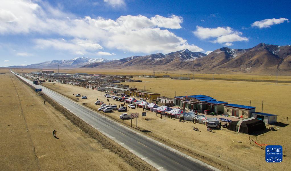 這是在青藏公路旁搭建的那曲縣香茂鄉畜產品展銷會(2017年11月25日攝,無人機照片)。新華社記者 劉東君 攝