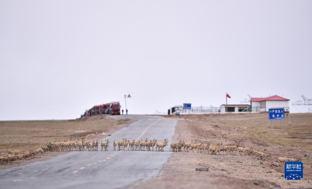 在青海可可西里,一群雌性待產藏羚羊正在通過青藏公路(2016年6月7日攝)。新華社記者 吳剛 攝