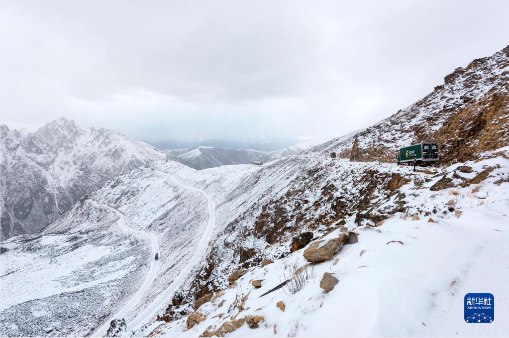 其美多吉與同事駕車行駛在雪線郵路上(資料照片)。其美多吉是中國郵政甘孜縣分公司郵運駕駛組的一名郵車司機,往返在甘孜縣與德格縣之間。這段路程是四川省甘孜州綿延5866公里、平均海拔超過3500米的雪線郵路最危險的一段。新華社發(周兵 攝)