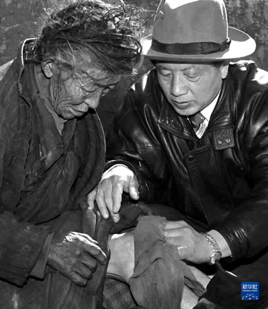 孔繁森(右)在西藏阿里日土縣過巴鄉看望孤寡老人益西卓瑪(資料照片)。新華社發