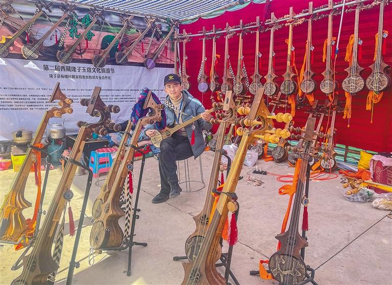 圖為銷售民族樂器的商戶正在為消費者現場彈奏“扎念”。