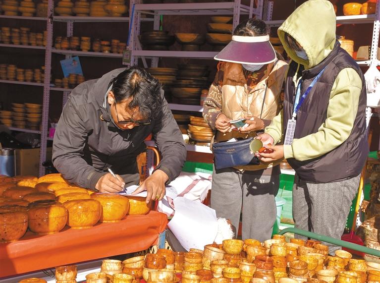 山南本地的特色優質商品尤其受到青睞:扎囊的氆氌,洛扎的粉絲,瓊結的蕎麥面,加查的核桃、木碗,貢嘎的邦典、紅土豆,措美的奶渣、牛羊肉等等,紛紛占據重要展位,引來消費者紛至沓來,熱情選購。