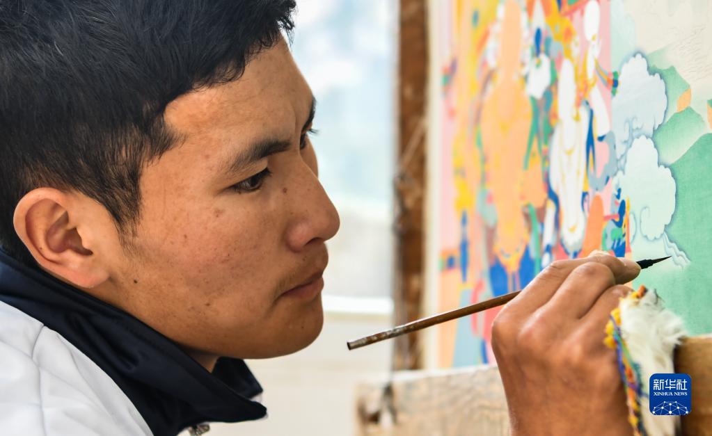 在西藏昌都市卡若區嘎瑪鄉民族手工藝培訓基地,學員正在學習唐卡繪畫。(2019年10月3日攝)新華社記者晉美多吉 攝