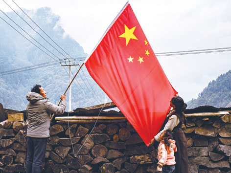 陳塘鎮居民尼瑪(右)和家人懸掛國旗(11月25日拍攝)。普布扎西、格桑邊覺、孫瑞博攝