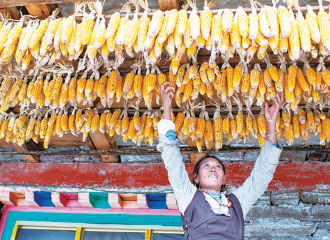 陳塘鎮夏爾巴人尼瑪在整理玉米(11月25日攝)。 普布扎西、格桑邊覺、孫瑞博攝