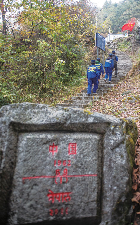 夏爾巴巡邊員們沿著中尼邊境巡邏時經過界碑(11月24日攝)。普布扎西、格桑邊覺、孫瑞博攝