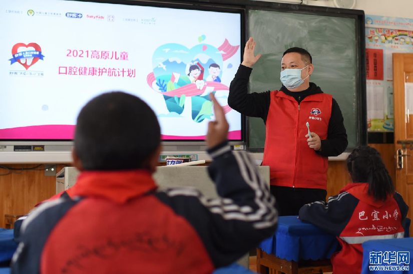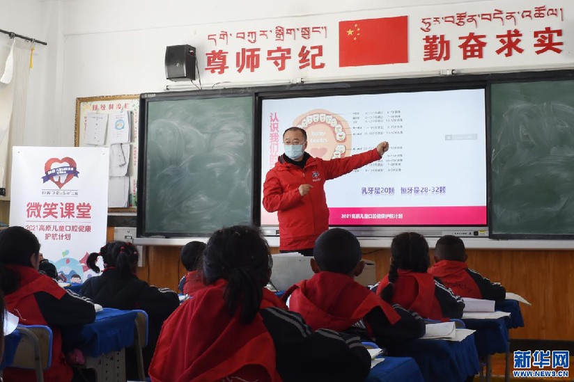 12月17日,薇美姿集團聯(lián)合創(chuàng)始人余立濤為學生們講解口腔健康知識。新華網(wǎng) 旦增努布 攝