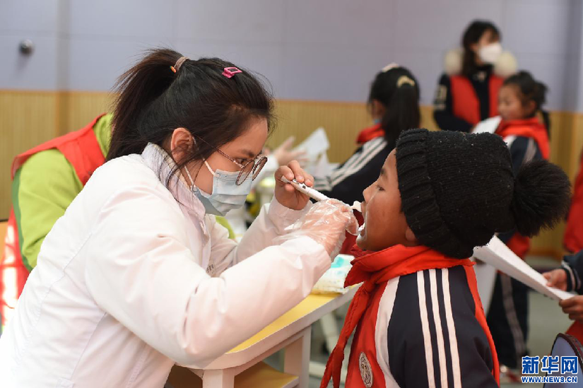 12月17日,來自青苗兒童口腔的醫(yī)生為學生進行口腔健康檢測。新華網(wǎng) 旦增努布 攝