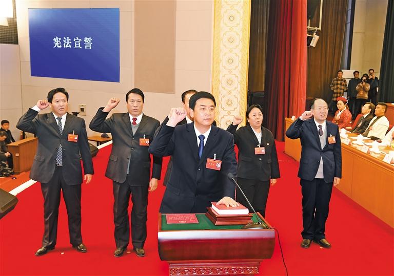 一月七日,自治區(qū)十一屆人大五次會(huì)議勝利閉幕。新當(dāng)選的自治區(qū)人民政府主席嚴(yán)金海,自治區(qū)第十一屆人民代表大會(huì)常務(wù)委員會(huì)副主任旦科以及委員向憲法莊嚴(yán)宣誓。記者 李洲 攝