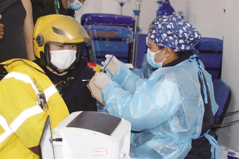 醫(yī)務(wù)人員為美團外賣騎手接種第三針新冠疫苗。圖片來自拉薩工會微信公眾號