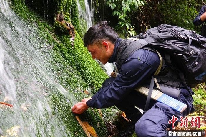 西藏自治區墨脫縣背崩鄉的原始叢林是戍邊民警日常巡邏之地。1月26日中午,中新社記者隨背崩邊境派出所民警一道,踏上了原始叢林中的巡邏路。圖為背崩邊境派出所輔警平措在溪流邊接水喝。 中新社記者 冉文娟 攝