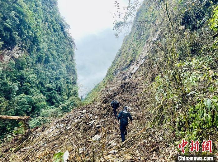 西藏自治區墨脫縣背崩鄉的原始叢林是戍邊民警日常巡邏之地。1月26日中午,中新社記者隨背崩邊境派出所民警一道,踏上了原始叢林中的巡邏路。圖為背崩邊境派出所民警經過泥石流沖刷區。 中新社記者 冉文娟 攝
