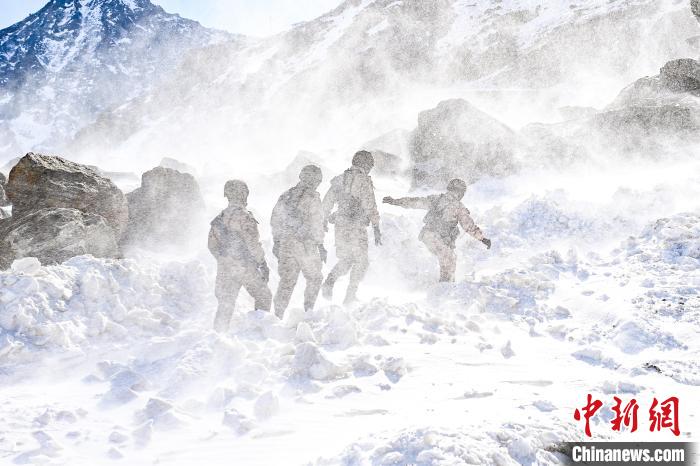 標沙拉錯哨點官兵艱難行走在風雪中。 劉志丹 攝