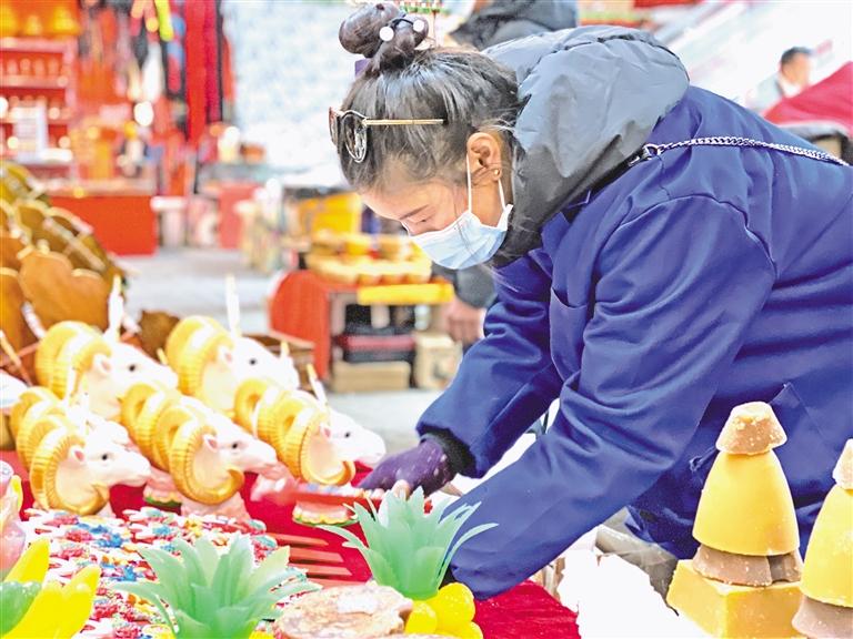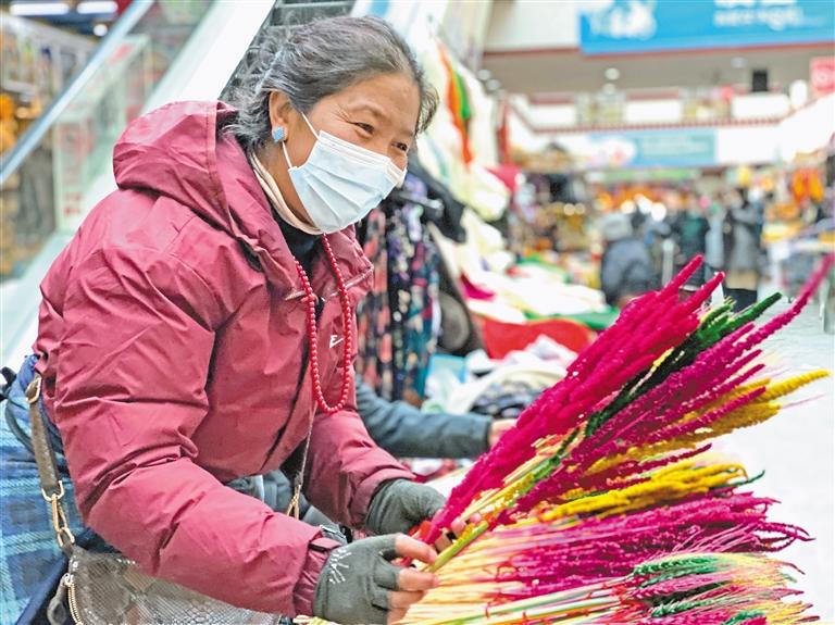 在雪域亙古浩瀚的歷史中,高原兒女自古以來便認定“羊”是吉祥的動物,代表了藏族群眾祈盼來年五谷豐登、六畜興旺。塑彩羊頭在藏語中稱為“隆果”,一般擺放在新年布置的貢品中央。“爸媽去年購買了一種用石灰制作的塑彩羊頭,今年我想購買陶瓷制作的塑彩羊頭放在爸媽家,去年買的拿回自己家,這樣既環保,也讓老人開心。”市民索朗旺堆在年貨攤位購買“隆果”時說。