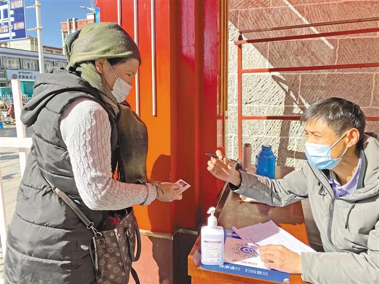 八廓商城市場部部長卓嘎介紹說:“為廣大市民提供一個安全、祥和的購物環境,我們在商場設有5個進出口,每個進出口都需掃行程碼、測量體溫后才可進入。因為有些老人沒有智能手機,無法掃健康瑪,我們會登記姓名、身份證號、聯系方式。并且在增加的攤位旁增設消防器材,不定時巡邏。”
