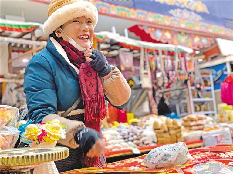 近年來,新春佳節貼“年紅”的傳統習俗日漸走進圣城雪域。如今,無論城市還是農村,幾乎家家戶戶都會在門上貼藏文春聯,增加喜慶的節日氣氛。來自墨竹工卡縣的平措卓瑪正在八廓商城年貨攤位前整理著春聯,去年已經擺過一次年貨攤位的她,在1個月的時間里掙到了8000元。“今年攤位抽簽時,心里特別緊張,怕位置不好,沒想到抽到了中間的好位置,這里采光足,紅彤彤的春聯在陽光下更好看了。新的一年,希望大家幸福安康、平安吉祥!”平措卓瑪懇切地說。
