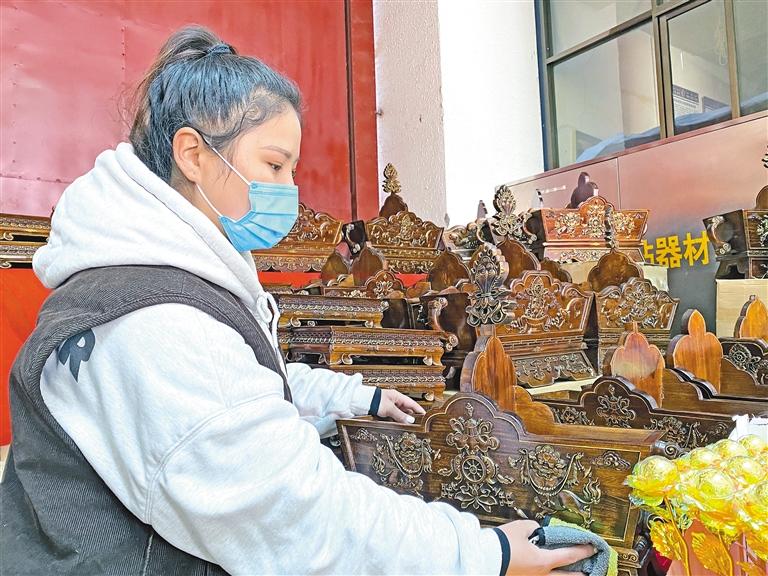 來自山南市貢嘎縣的拉吉帶著自家生產的“切瑪盒”第2次來到八廓商城年貨市場。“由于是自家生產,所以我們自主設計了一款線條稍微簡約的‘切瑪盒’;還有一款傳統線條與圖案的‘切瑪盒’。在顏色上,我們選擇了較為持重的深色,這樣的顏色大氣沉穩,許多市民非常喜歡,兩款售價都是380元。”拉吉介紹道。