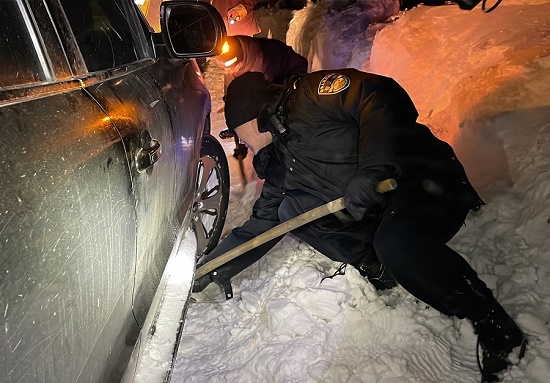 在到達現場后,救援民警立即為早已凍得瑟瑟發抖的被困人員送上了熱水和防寒大衣,并安撫了被困人員情緒。在勘察了現場的情況后,救援民警一邊用鐵鍬和雙手迅速清理車輛底盤的厚冰,一邊用牽引繩嘗試將被困車輛進行拉出,因積雪太厚嘗試多次未能成功,隨后,協調到朗縣養護段一輛推土機,經過一個小時救援,被困車輛成功被拖出。被困人員救出來后,為了確保車輛人員的絕對安全,金東邊境派出所救援民警全力護送被困人員于晚上11點45分安全抵達單位營區,救援工作取得圓滿成功。