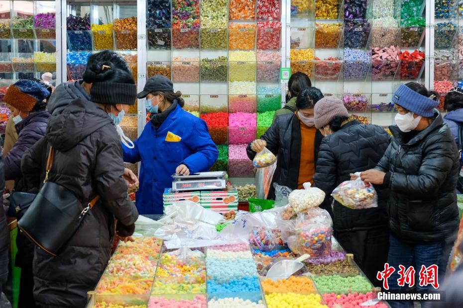 目前正值藏歷12月下旬,西藏即將迎來傳統藏歷水虎新年,拉薩民眾也全面進入“藏歷新年時間”。2月27日下午,小新在西藏最大的傳統綜合市場——拉薩沖賽康市場周邊看到,羅薩美朵、卡塞、酥油、切瑪盒、糖果、干果、藏式服裝等年貨琳瑯滿目,購買的市民也進入“最后”的采購時間,市場周圍人群絡繹不絕,高原迎春、年味十足。圖為一商販在拉薩沖賽康市場周邊銷售藏歷新年年貨“褪”。江飛波 攝
