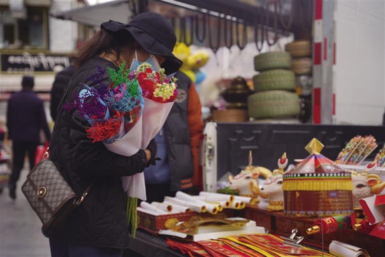 千門萬戶曈曈日,總把新桃換舊符。隨著各民族交往交流交融,藏文對聯也逐漸成為藏歷新年年貨市場中不可缺少的“成員”,寄托了人們對來年美好生活的殷切期盼。走進沖賽康市場,記者看到很多攤位都擺放著各式各樣紅色藏式對聯,內容主要蘊含平安、健康、長壽等吉祥的寓意,不時還有市民前來詢價選購。此外,每年藏歷新年前,不少書法家還會將滿載祝福的對聯寫好后送給市民,把濃濃的年味和對藏歷新年的祝福送到大家手中。