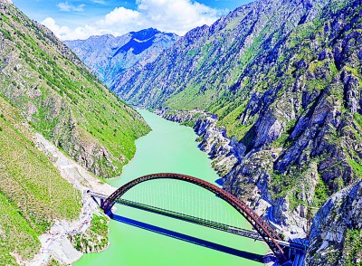 復興號列車行駛在川藏鐵路拉林段藏木特大橋。新華社發
