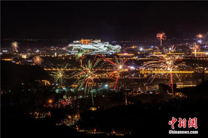 2021年2月10日晚,藏歷新年辭舊迎新“古突”夜,拉薩夜空煙花璀璨。當日是藏歷12月29日,自此,藏族民眾一年中最隆重的節日——藏歷新年的一系列活動正式拉開序幕。中新社記者 何蓬磊 攝