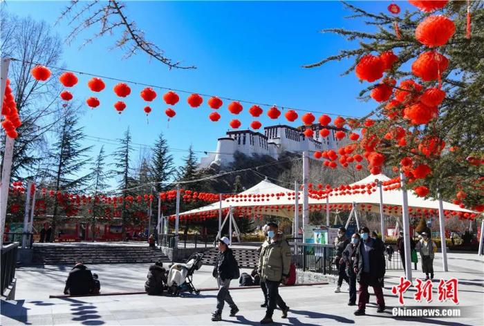 2022年1月29日,拉薩宗角祿康公園內,大紅燈籠高高掛起。隨著新春佳節和藏歷新年的臨近,古城拉薩大街小巷張燈結彩,洋溢著喜慶的節日氛圍。中新社記者 貢嘎來松 攝