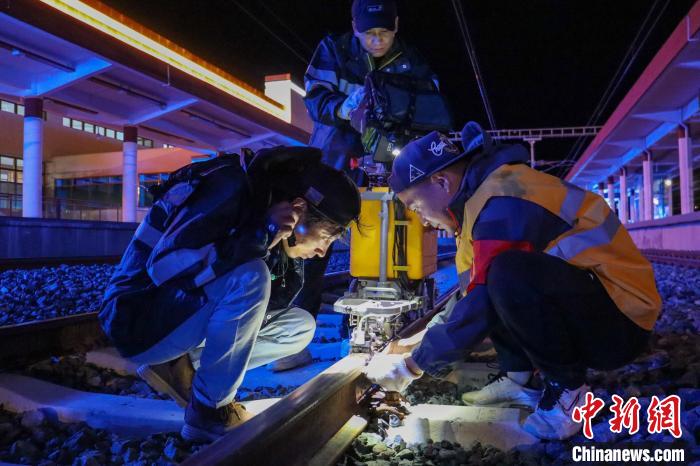 工人夜間對拉林鐵路鋼軌進行病害檢測。 拉巴次仁 攝