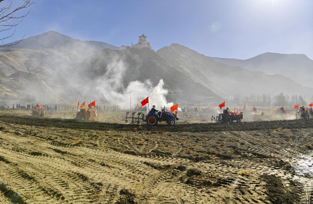 日頭漸高,春耕儀式準備就位。門中崗社區黨總支書記央金卓嘎說:“開耕嘍!”頓時,14臺拖拉機發出隆隆轟鳴聲,肥沃的田地被犁出一道道深深的壟溝。