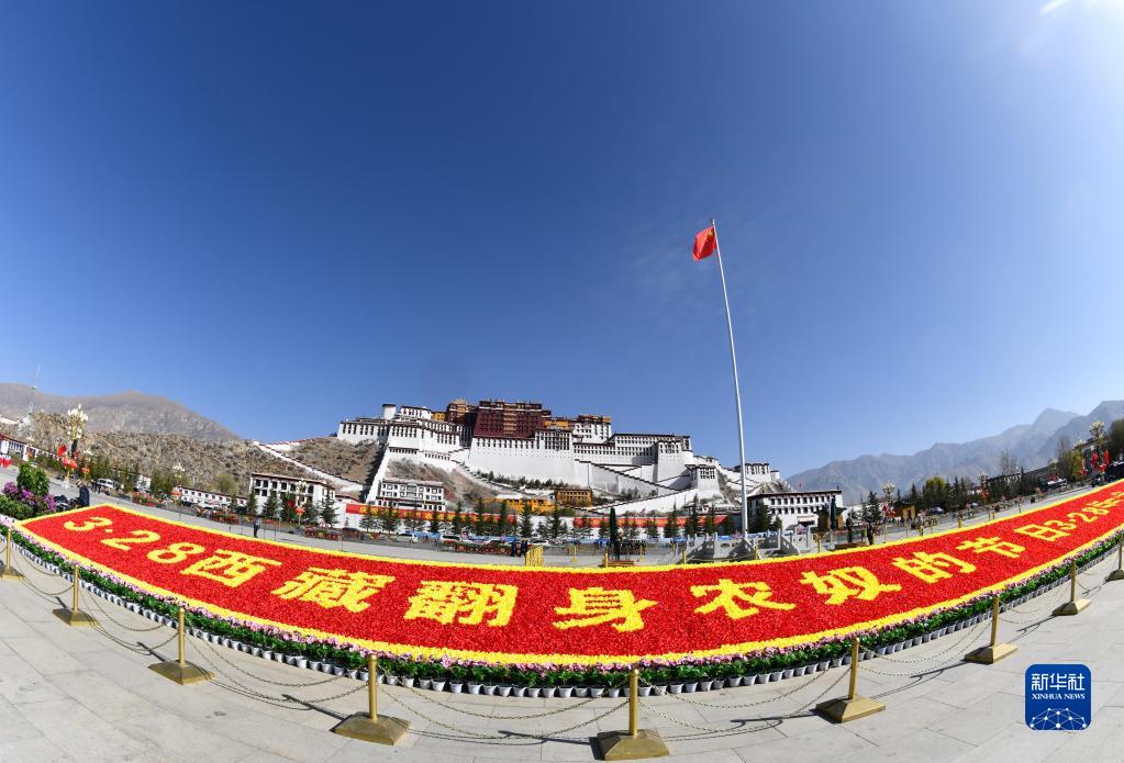 63年后的今天,春風和煦,陽光明媚。上午9時40分,在《翻身農(nóng)奴把歌唱》的伴奏下,西藏各族各界群眾代表聚集在拉薩布達拉宮廣場。蔚藍的天空下,和平鴿展翅翱翔。