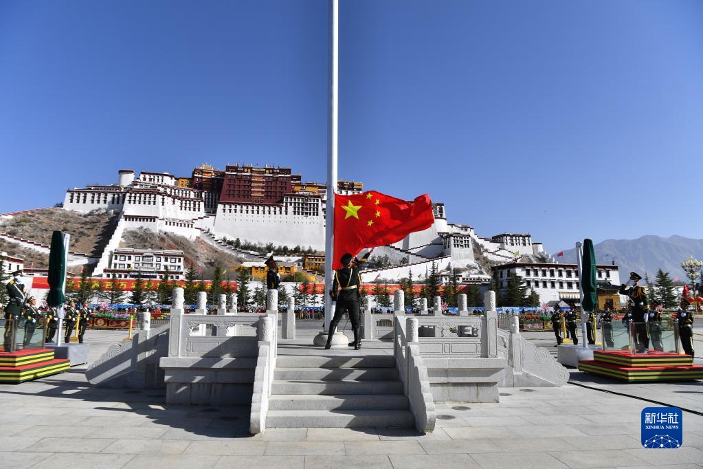 上午10時,隨著《義勇軍進行曲》的響起,五星紅旗在布達拉宮廣場迎風飄揚。大家肅穆而立,向著國旗行注目禮。