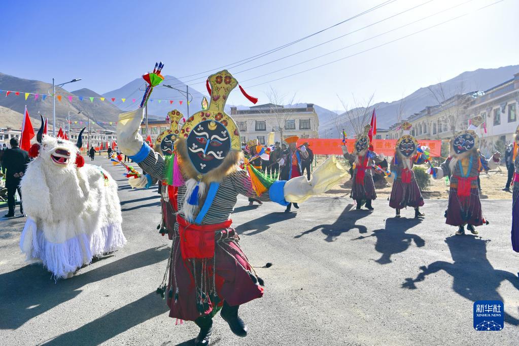 3月28日,南木林縣卡孜鄉群眾在湘河水庫移民新村表演藏戲。新華社記者 張汝鋒 攝