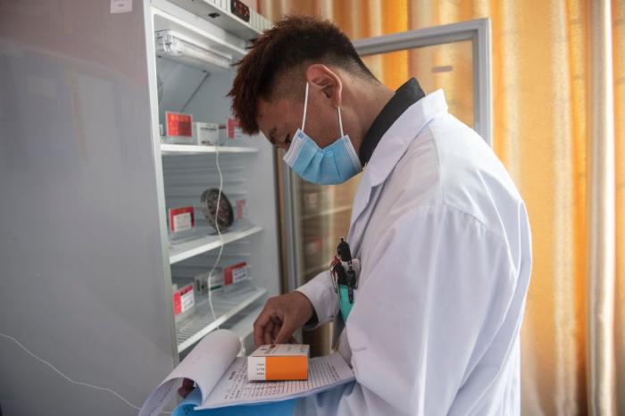 米瑪次仁在林芝市巴宜區更章鄉衛生院清點疫苗庫存情況(2021年12月24日攝)。新華社記者 孫瑞博 攝