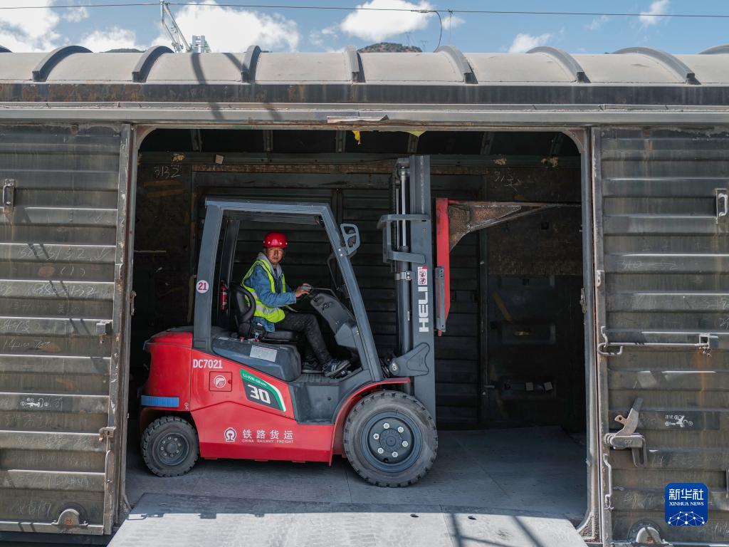 林芝市巴宜區布久鄉朵當村村民邊巴在林芝站貨場駕駛叉車(3月29日攝)。新華社記者 洛卓嘉措 攝