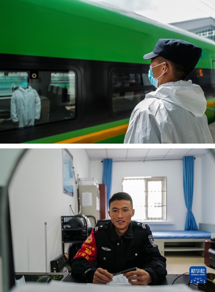 拼版照片:上圖為3月31日,白瑪旺扎在列車即將駛離車站時執勤(新華社記者洛卓嘉措攝);下圖為白瑪旺扎在派出所接待窗口(新華社記者劉潁攝)。今年24歲的白瑪旺扎2021年8月起在林芝站派出所擔任輔警,他的家位于離車站3公里的麥巴村。鐵路的開通讓他解決了就業,同時還能照顧家庭。新華社發