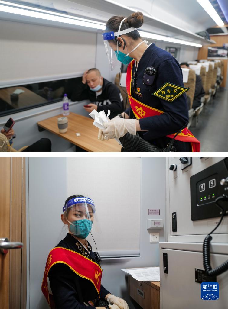 拼版照片:上圖為3月27日,劉文靜在列車上檢查衛生;下圖為劉文靜在列車廣播室。C893次列車長劉文靜已經在鐵路工作近十年,先后在青藏、拉日、拉林三條鐵路線任職,親身經歷十年來西藏鐵路運輸的巨變。新華社記者 洛卓嘉措 攝
