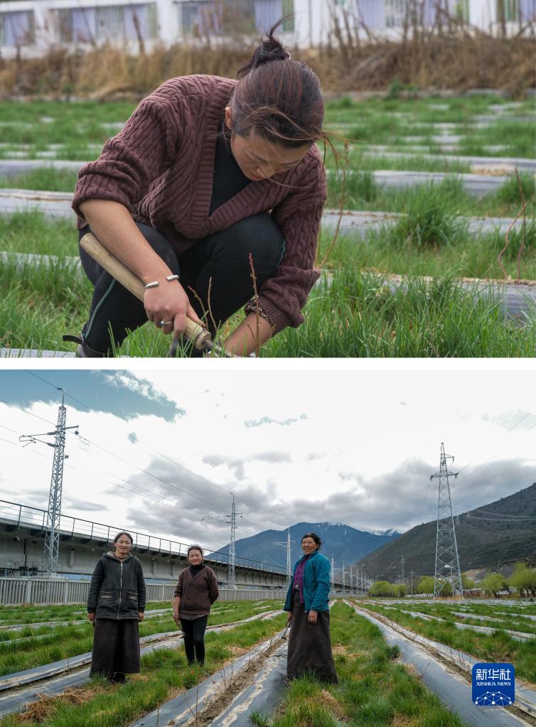 拼版照片:上圖為3月30日,尼瑪德吉在藍莓種植基地工作;下圖為尼瑪德吉(中)及同事站在藍莓種植基地中,背后是鐵路橋。麥巴村村民尼瑪德吉今年剛滿20歲,此前在林芝巴宜區一家藏餐館打工,后來回到村里設立的藍莓種植基地工作。尼瑪德吉說,能在家門口工作令她很開心,她每天都能看到火車從旁邊經過,希望有一天也能坐上火車去拉薩逛一逛。新華社記者 洛卓嘉措 攝