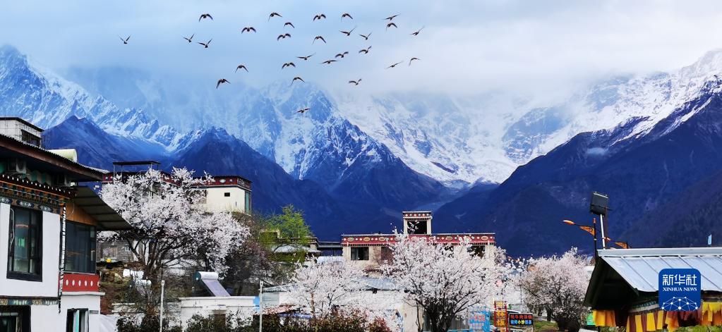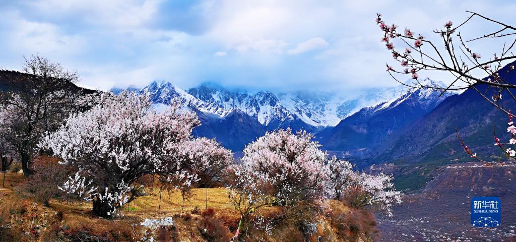 雅魯藏布江河谷一路桃花盛開,和雪山相映成趣。圖為米林縣索松村遠眺南迦巴瓦峰。新華社記者 沈虹冰 攝