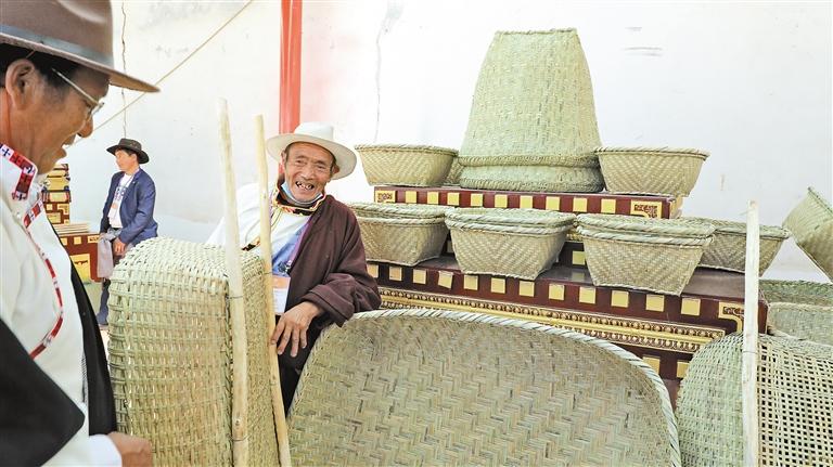 圖為尼屋鄉(xiāng)農(nóng)牧民曲加在第七屆“尼屋桃花節(jié)”特色產(chǎn)品展銷區(qū)域售賣自己手工編織的竹筐。記者 萬(wàn)靖 通訊員 索朗 攝