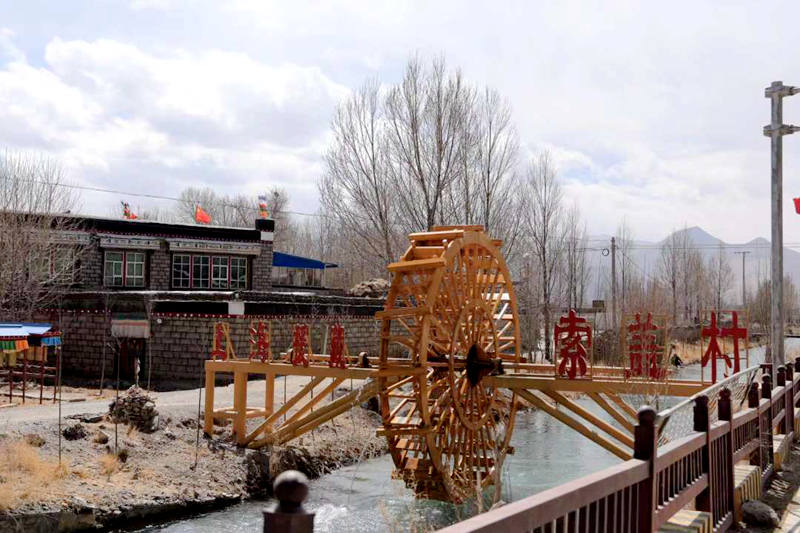 走進索蓋村,映入眼簾的就是一架大水車,上面刻著“上海援藏 索蓋村”四個小字、三個大字。