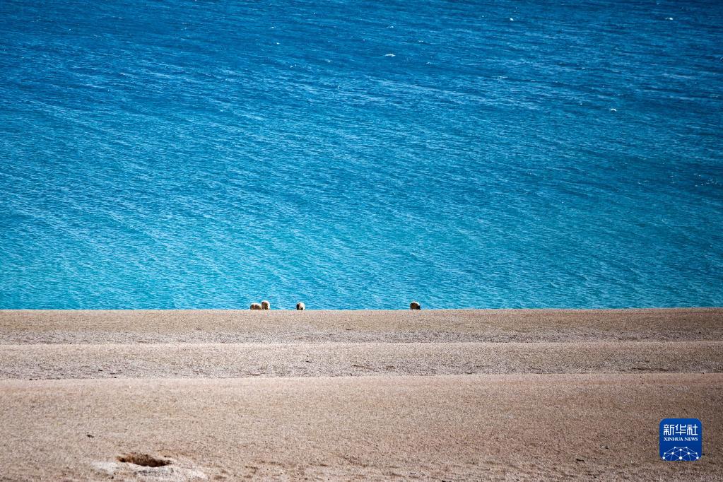 在位于西藏自治區那曲市的巴木錯,羊群在湖邊吃草(2022年4月13日攝,手機照片)。新華社記者 沈虹冰 攝