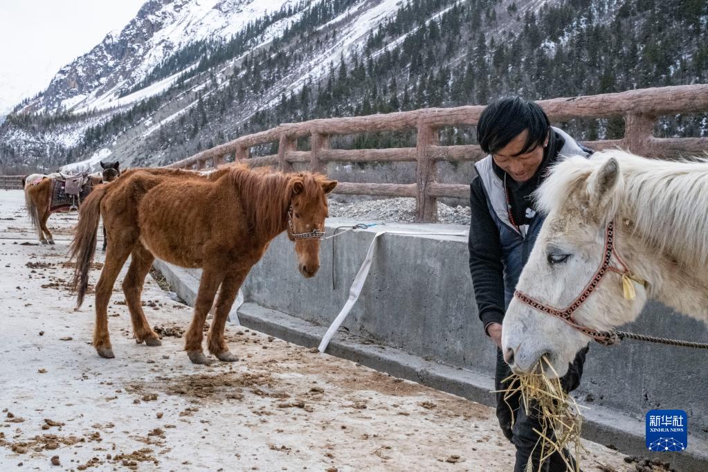 村民在林芝市波密縣境內的米堆冰川腳下喂馬(4月23日攝)。新華社記者 孫非 攝