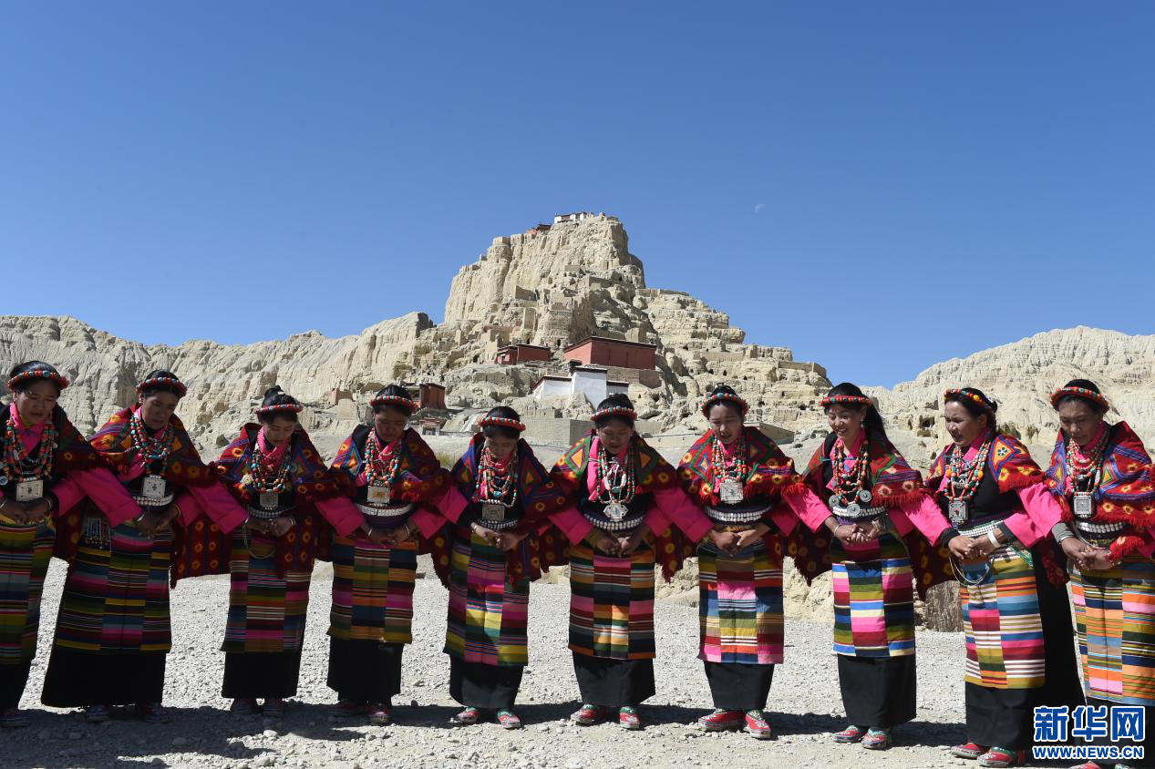 4月23日,當地群眾在古格王朝遺址腳下表演宣舞。新華網 旦增努布攝