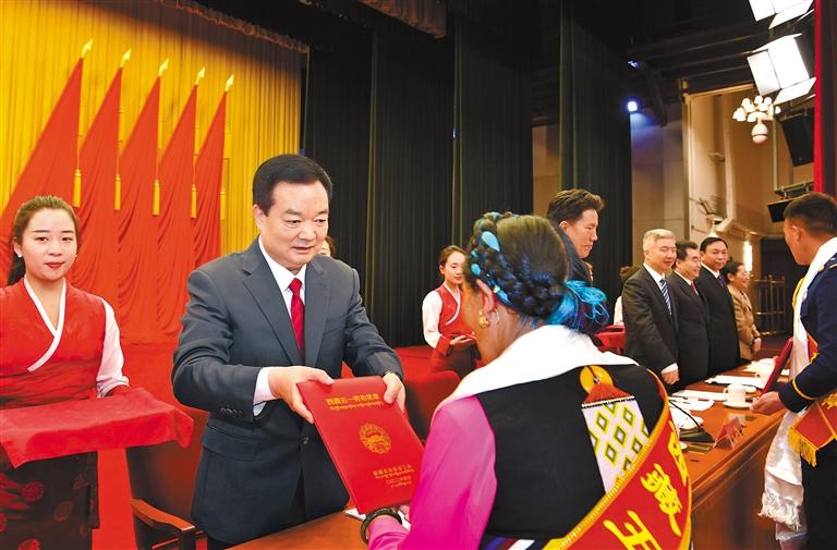 4月29日上午,西藏自治區慶祝“五一”國際勞動節暨表彰大會在拉薩舉行。自治區黨委書記王君正出席會議并講話。這是王君正為受表彰代表頒獎。記者 旦增西旦 攝