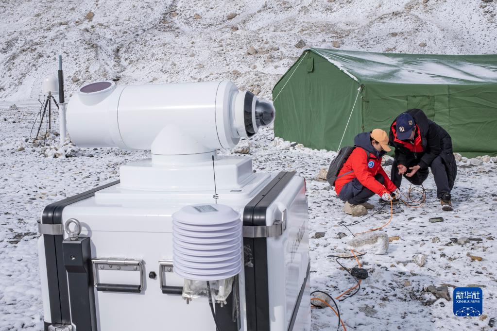 在珠峰登山大本營,科研人員給激光測風(fēng)雷達布線(4月30日攝)。新華社記者 孫非 攝
