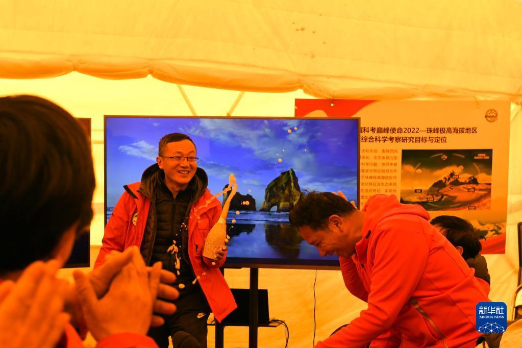 在珠峰腳下海拔5200米的總指揮會議室帳篷里,大家熱烈慶?!皫p峰使命”珠峰科考登頂觀測采樣成功(5月4日攝)。新華社記者 姜帆 攝