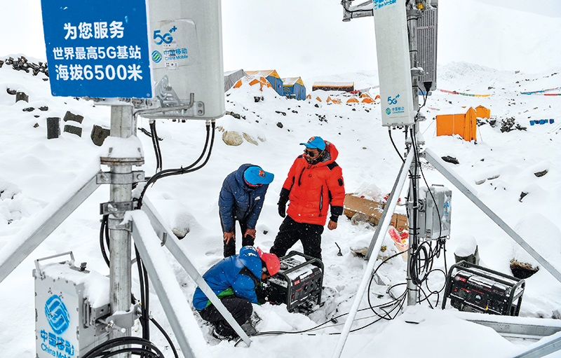 在海拔 6500 米的珠峰前進營地,中國移動工作人員在調試 5G 基站(2020 年 5 月 21 日攝) 晉美多吉 攝