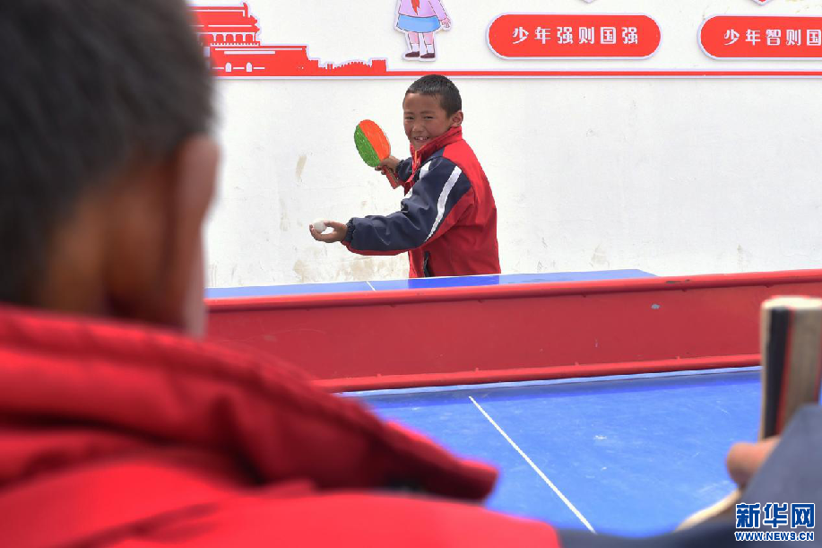 多油村中心小學的學生在課余時間玩乒乓球(4月21日攝)。新華網 旦增努布攝