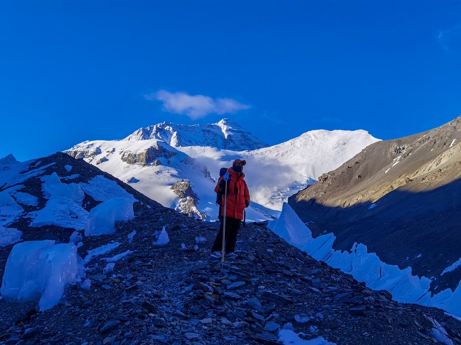 冰川與污染物小組在東絨布冰川觀察測量(5月5日攝,手機照片)。新華社發(fā)(受訪者供圖)